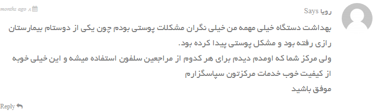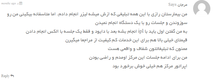 یک مرکز معتبر لیزر، اولا یک تکنسین خوب دارد، و ثانیا جدای از اینکه همه ی جلسات را با بهترین دستگاه های لیزر انجام می دهد، نکات بهداشتی لازم را نیز رعایت می کند. مثلا به این نظر از یکی دیگر از مراجعه کنندگان ما دقت کنید: